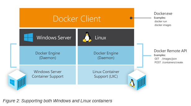Containers are managed with the Docker engine that runs on Windows or Linux. To manage the Docker engine on either Windows or Linux, the same Docker client can be used – the commands are the same for both platforms. The Docker client can be installed on the same box that runs the Docker engine or on a separate box.