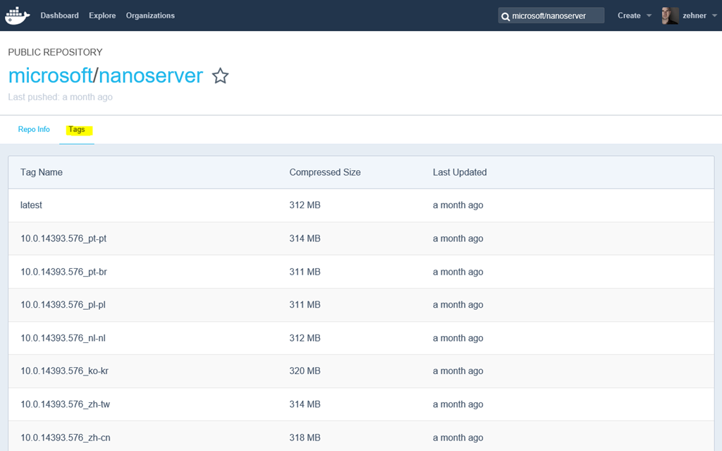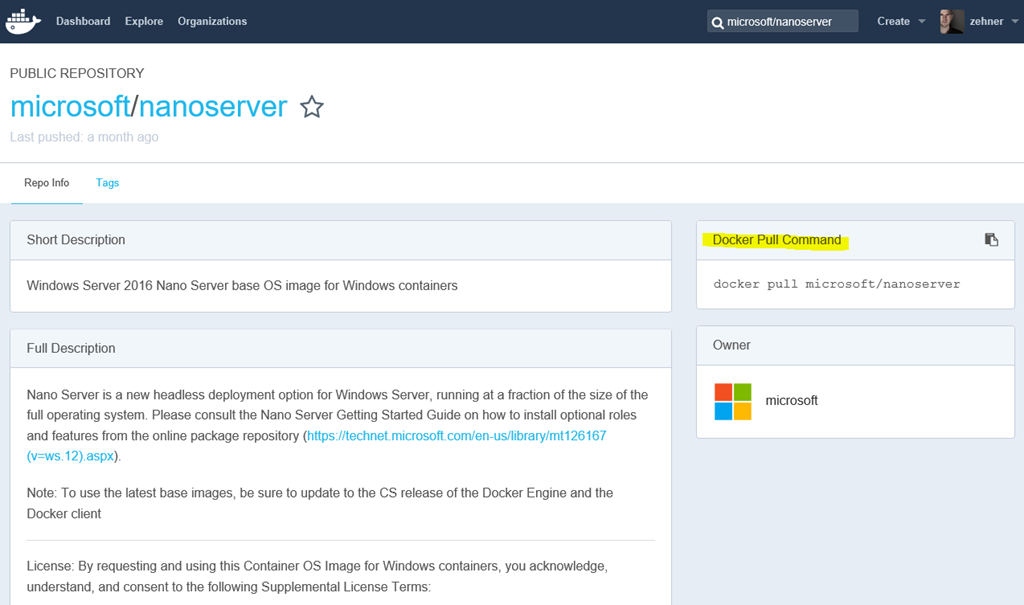 Before we can start and use our first container, we need to download a container image. Every container is based on an image that is available on the container host. Images can be downloaded from a registry. When talking Docker, this is a platform that allows organizations and individuals to publish container images in either public or private repositories. Visit Docker Hub for more details. For this example I use the public “microsoft/nanoserver” repository that hosts different versions of containers that run a Windows Nano Server. To get some more insights, we first navigate to the Docker Hub website and browse the repo.