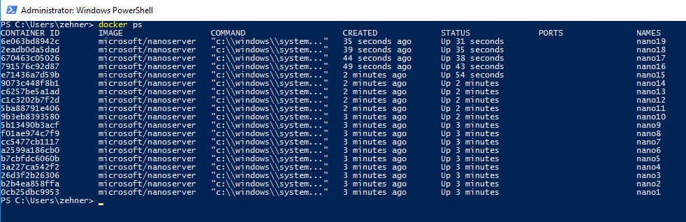 A last thing I want to cover here is bulk management of containers and images. Let’s say you need many containers for testing, scaling or whatever. You can use a simple PowerShell script to create and run multiple containers.