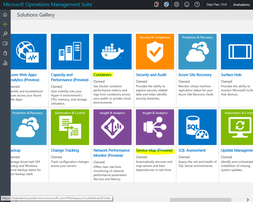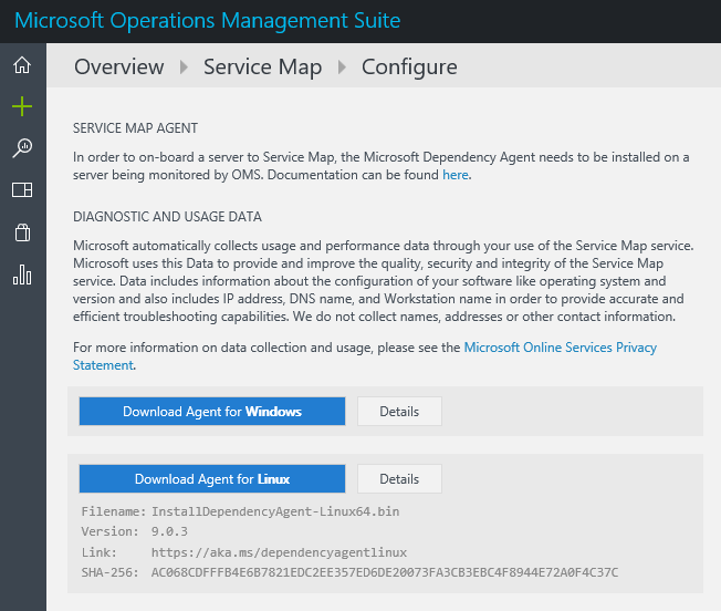 Once the OMS agent is installed, we can continue with the Dependency Agent for the Service Map solution. But first, let’s add the 2 solutions using the the solutions gallery on the OMS website.
