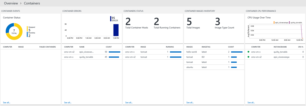 This solutions gives you insights about the container hosts and containers that are running on the host. To make sure you will see something start some containers. I will use some simple containers (hello-world, ubuntu) and a specific container that runs Apache Tomcat. I will only go into the Tomcat container example.