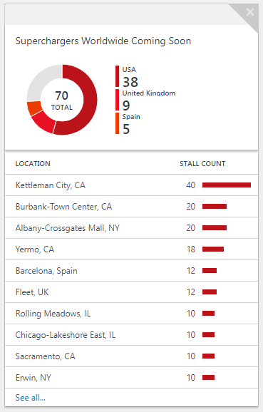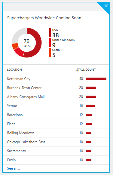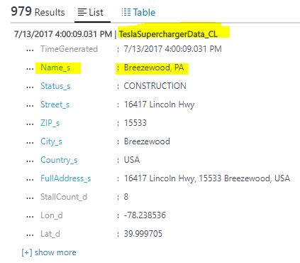 Pay special attention to the property “Name_s”. This is the City and State of a Supercharger. Both values are separated with a comma. Based on those events I created some custom views: