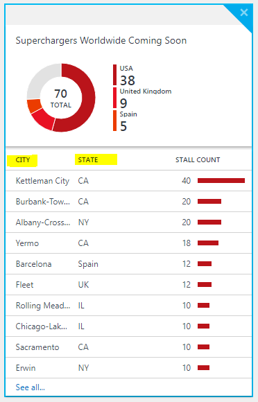 OK, it seems the query pulls back all TeslaSuperchargerData for Superchargers with a specific status. Each Supercharger is listed with its name, but the columns is named “Location” to make it easier to understand. As mentioned, the name/location is in format “City, State”. As the data was collected that way one could think that this is exactly what we need to display and that it cannot be changed.