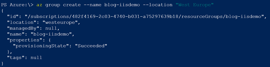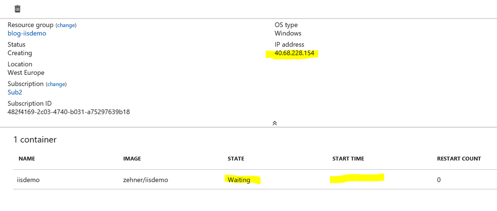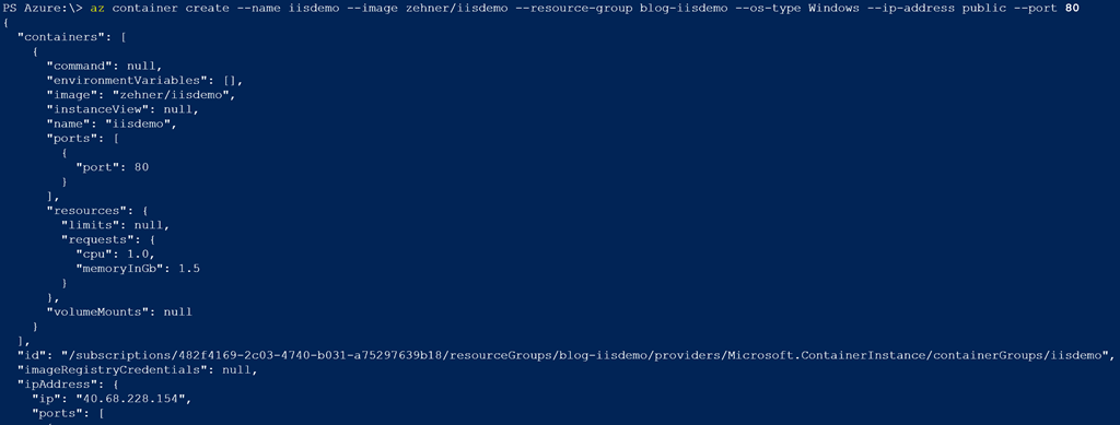 az container create –name iisdemo –image zehner/iisdemo –resource-group blog-iisdemo –os-type Windows –ip-address public –port 80