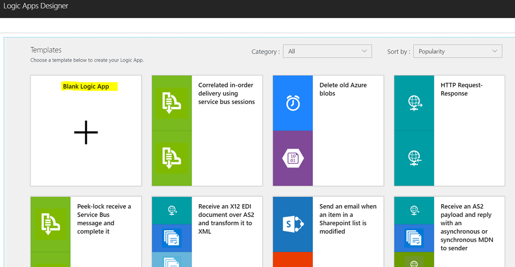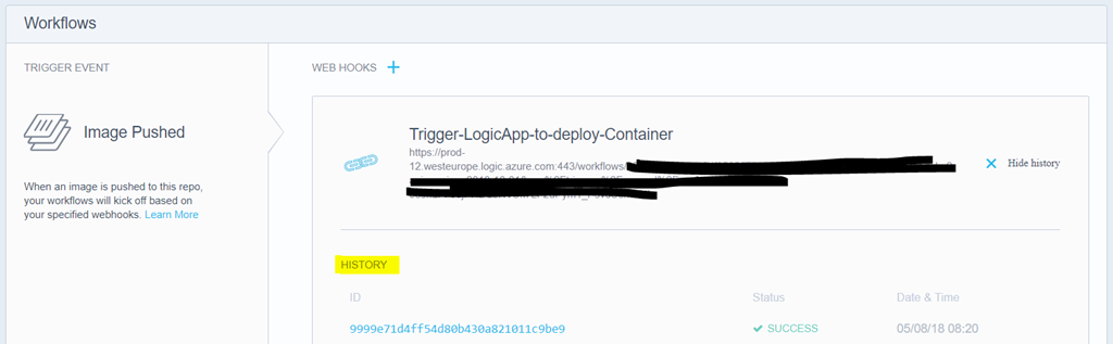 I will cover and demonstrate, how to automatically deploy new ACI containers when a Docker image is pushed back to Docker Hub. This could be used as a simple release procedure to test new Docker images on Azure. For that, I will use Azure Logic App, a serverless component that allows me to design workflows. This workflow will be triggered directly from Docker Hub using a webhook. Let’s go.