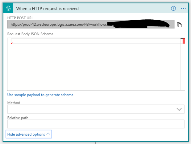 The first one is the trigger action and defines, how this workflow will be triggered. I use a HTTP request trigger which means, that I can use a web request to a specific URL to trigger the workflow. In this simple example, no more configuration is needed as I will not pass anything when triggering the workflow. The only thing I need to do here is memorizing the URL – or better copy it to the clipboard.