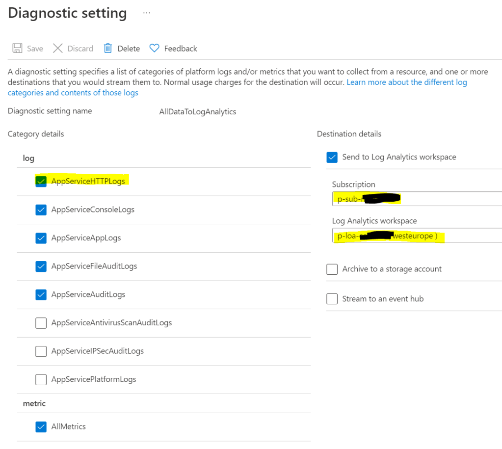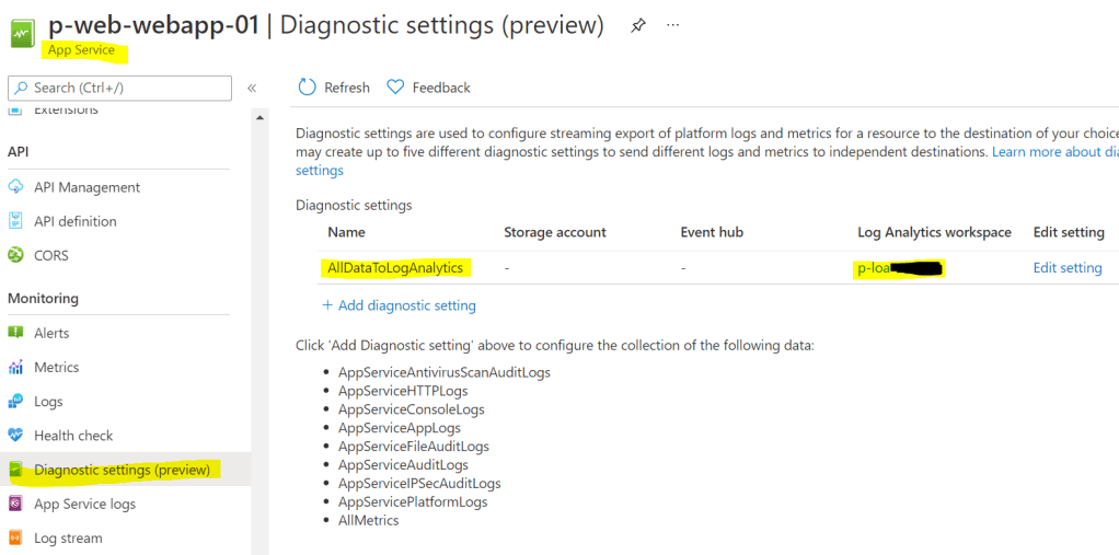 When this configuration goes live, you will discover the health probes in the logs of your app. In this demo scenario, I use a simple web app that has diagnostics logging enabled. Events are forwarded to a Log Analytics workspace.