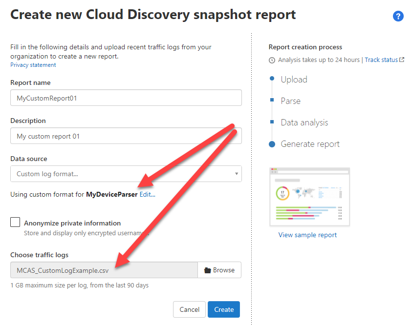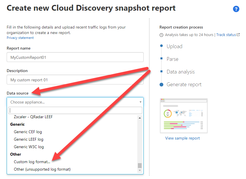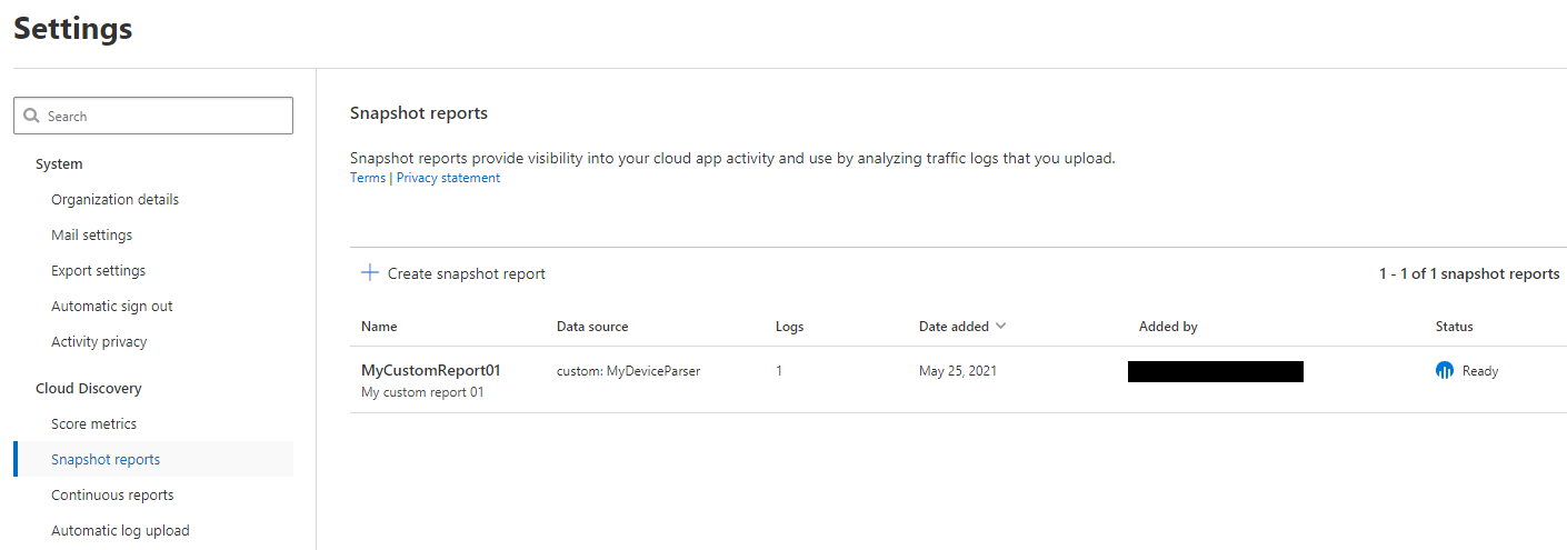 Now it’s time to upload the log file to MCAS. The simplest way to do this it through the creation of a new snapshot report.