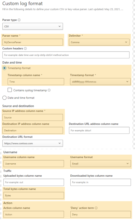 Now it’s time to map the log file columns so that MCAS can understand and map them accordingly. Some mappings are mandatory because without those, MCAS could not translate the log rows into meaningful information. Some are optional, but the more mappings you configure, the more valuable the information will be for your organization.